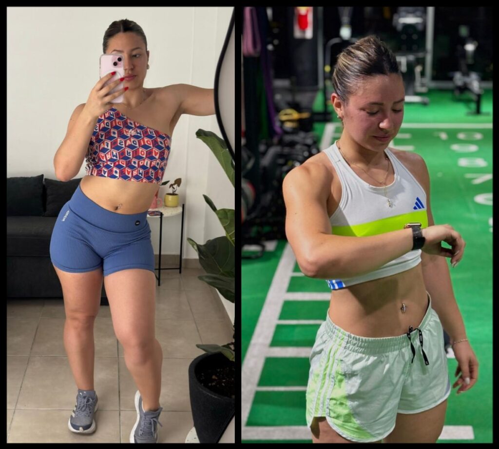 “Con Tomi nos propusimos hacer una recomposición corporal en 8 semanas, hice deficit calórico y entrenamos 4 veces por semana. Aprendí a comer y a escuchar mi cuerpo. Soy feliz por el cambio que logré.” – Romi Almeida. (ig: @almeidarom)